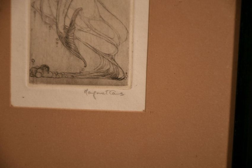 An art nouveau etching of a mermaid with a fish, indistinctly signed in pencil, 7.5" x 2.5".