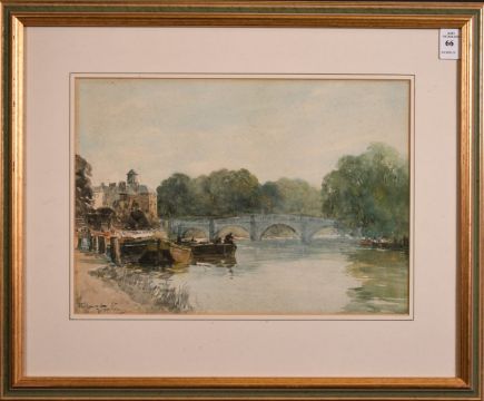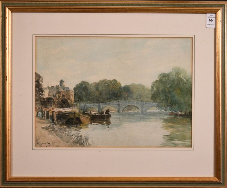 Thomas Swift Hutton (1860 - 1935) British school, a scene of Richmond bridge with figures on the bank, watercolour, signed indistinctly, 9.5" x 13.5"