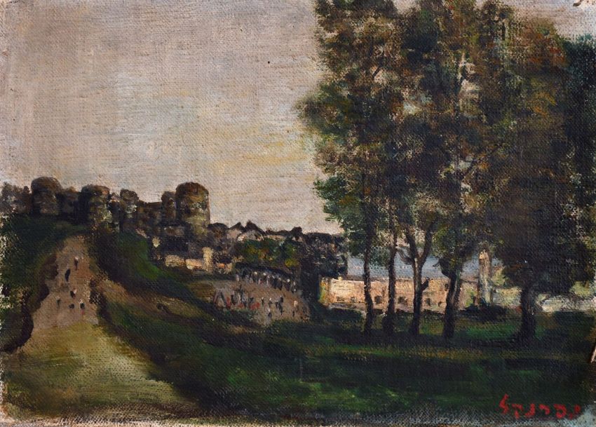 20th century continental school, a landscape with a castle by the coast, oil on canvas, indistinctly signed, 8.5" x 11.75". (unframed)