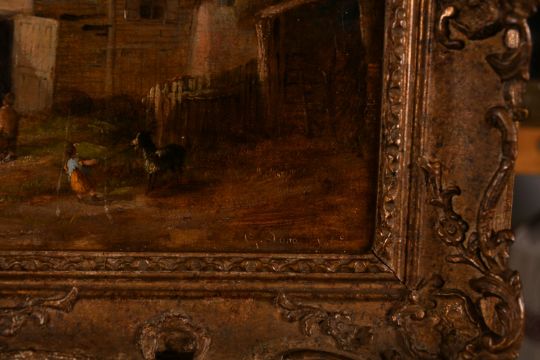 Georgina Lara (19th century) British, A pair of scenes of figures and horses in village settings, oil on canvas laid down, 8" x 15".