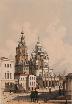 Anatole de DEMIDOFF & André Durand. VOYAGE PITTORESQUE ET ARCHEOLOGIQUE EN RUSSIE, A pair of lithographs of street scenes, circa 1840, " Moscou (Moscow), CATHEDRALE D'OUSPENSKI." And "COUR INTIRIEURE DU CHATEAU", lithograph, both 19" x 12.5".