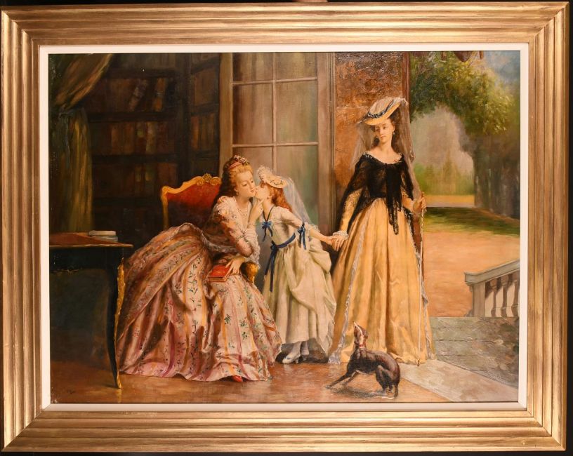 20th century school, a scene of three elegant figures in a country house, oil on canvas, indistinctly signed, 30" x 40".