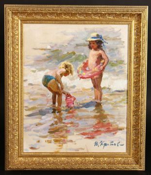 Yuri Krotov (b.1964) Russian, 'Young Sunbathers', signed oil on canvas 18.5" x 15.75", 47x40cm.