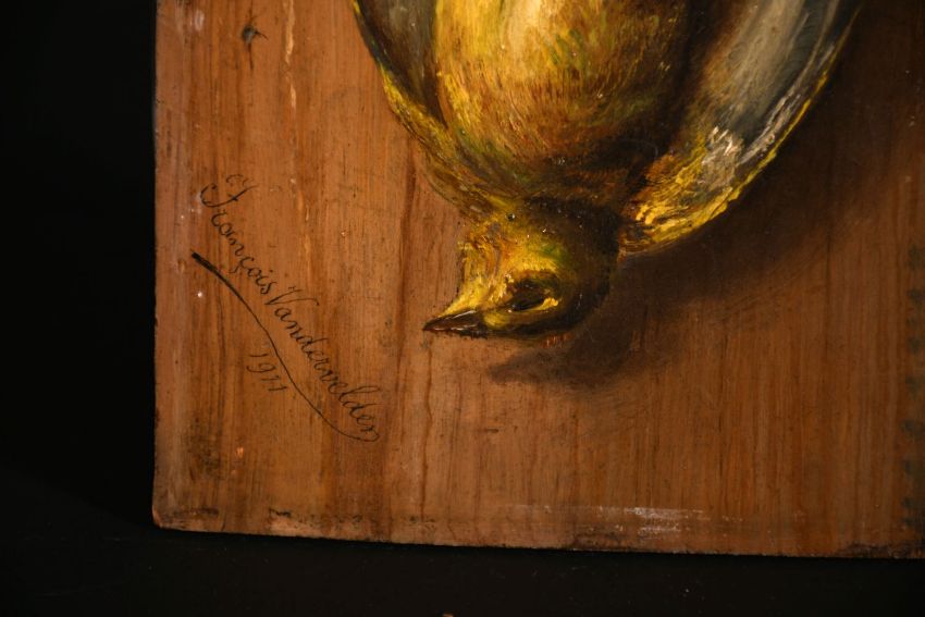 Fran ois Vandervelden (19th/20th century) A still life of dead songbirds, oil on panel, signed and dated '1911', 20" x 6". (unframed)