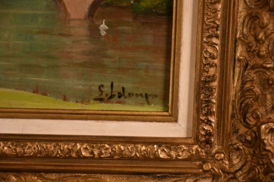 E. Lalonge (20th century) French school, a river landscape with a bridge and buildings, oil on board, signed, 14" x 18".