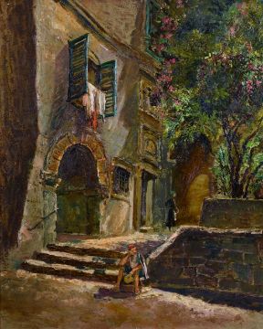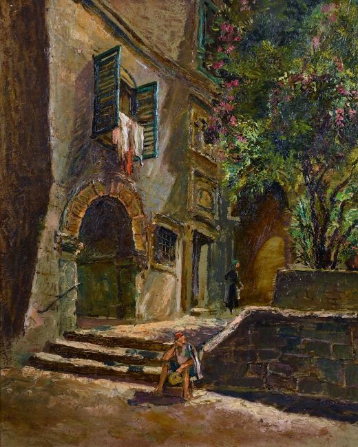 Jack Cross (early 20th century) British, continental street scene with figures by a blossoming tree, oil on board, 17" x 14".