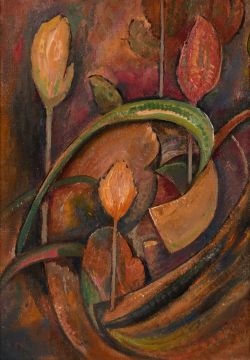 Henry Samuel Merrit (1884-1963) British, A stylised still life scene of flowers and foliage, oil on board, 14" x 10".