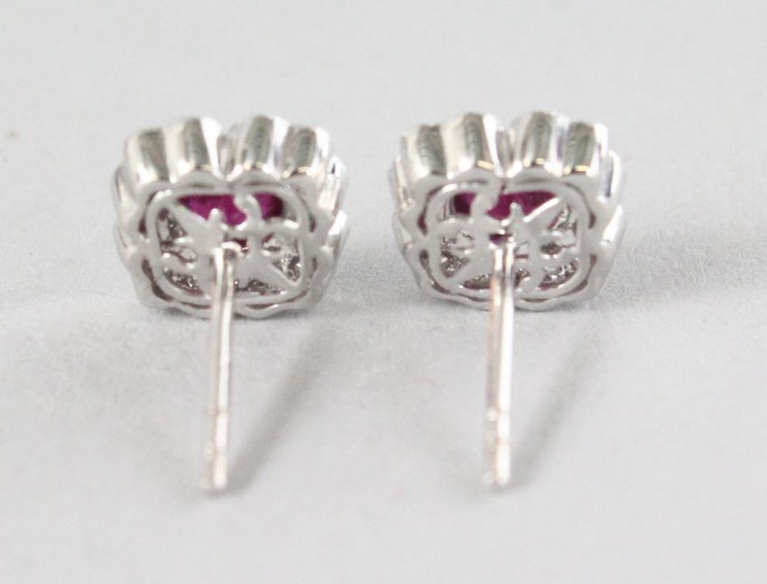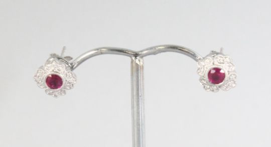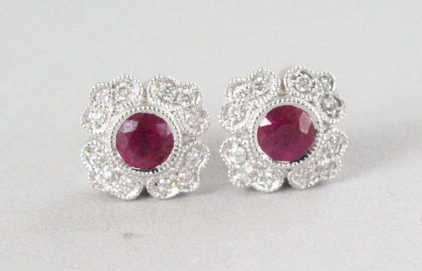 A PAIR OF 18CT WHITE GOLD VINTAGE FLOWER SHAPED RUBY (0.62cts) AND DIAMOND (0.14cts) EARRINGS.