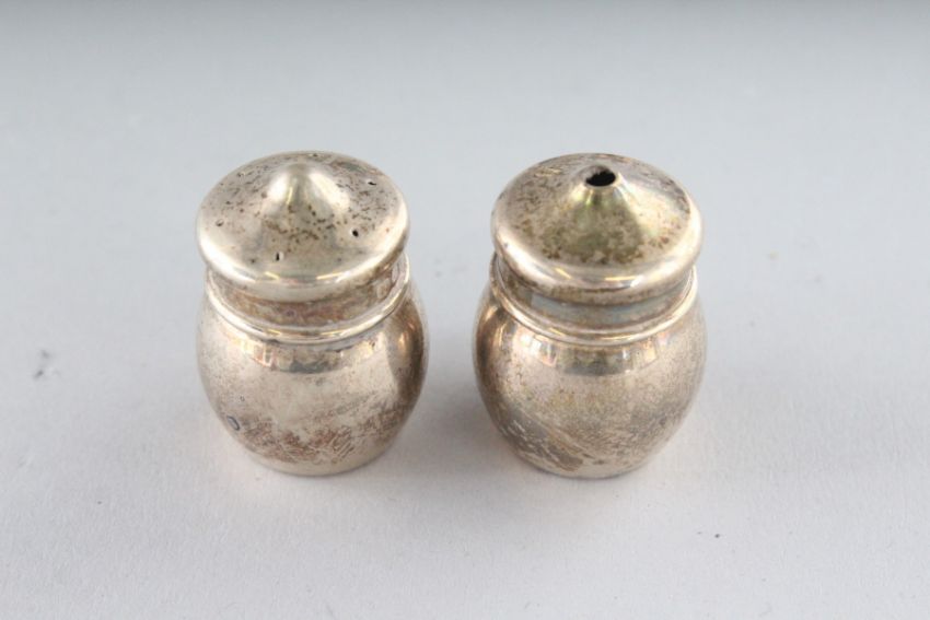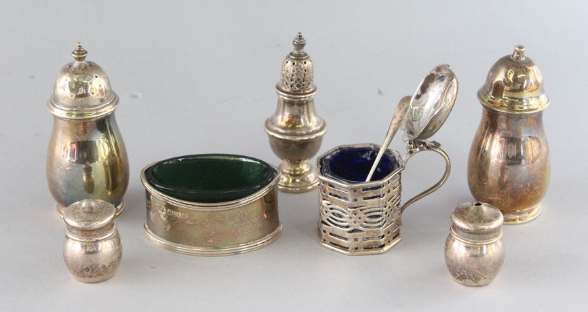 A SILVER SALT AND PEPPER, Birmingham 1941, and a pepperette, oval salt, mustard pot, salt and pepper (7).