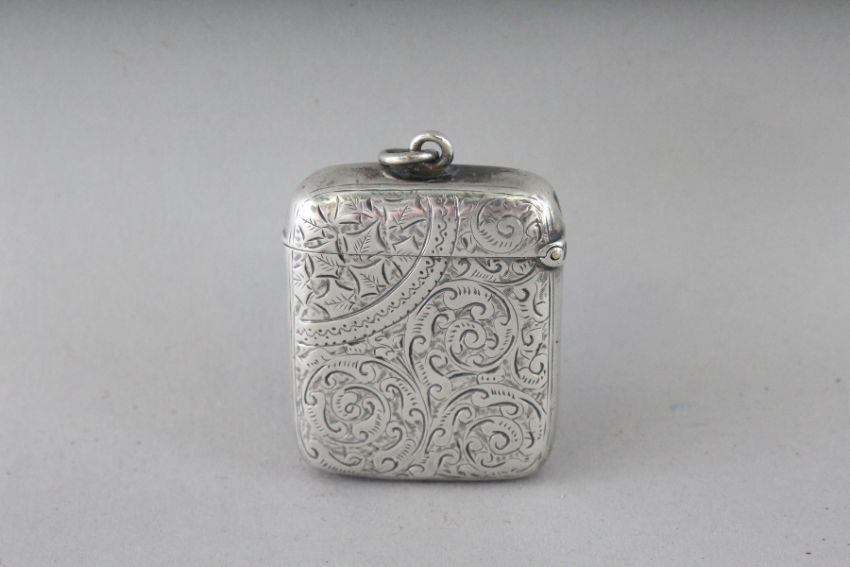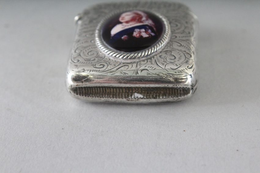 A VICTORIAN ENGRAVED SILVER VESTA CASE, Birmingham 1894, with an enamel oval of Queen Victoria.