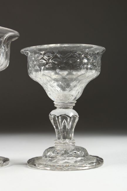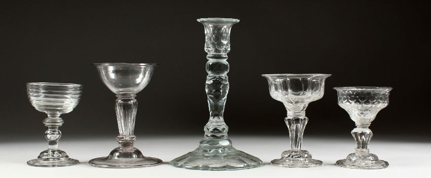 A GOOD 18TH/19TH CENTURY CUT GLASS CANDLESTICK; together with four 19th century cut and moulded glass pedestal sweetmeat dishes/stands.