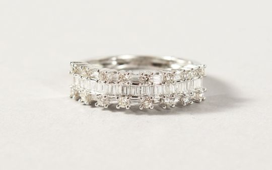A VERY GOOD 18K WHITE GOLD BAGUETTE BAND RING.
