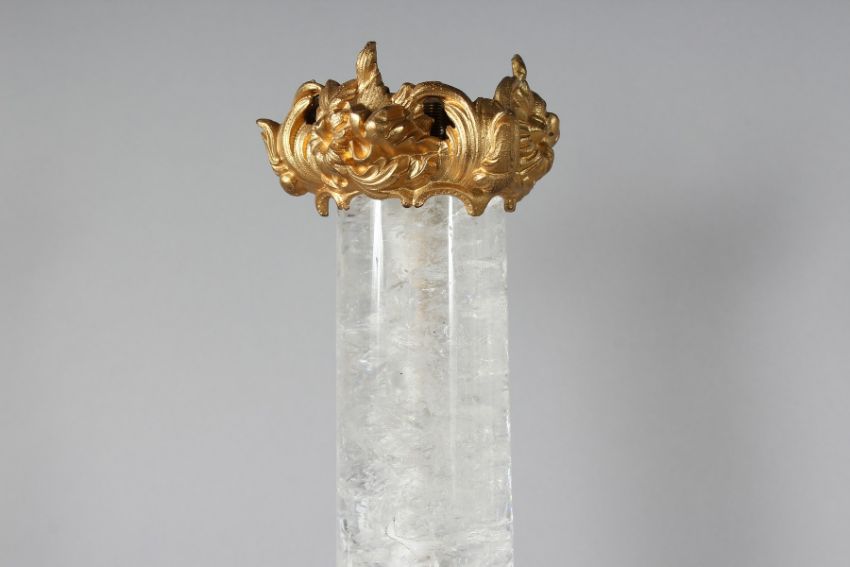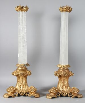 A SUPERB PAIR OF ROCK CRYSTAL AND ORMOLU LAMPS.