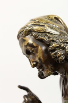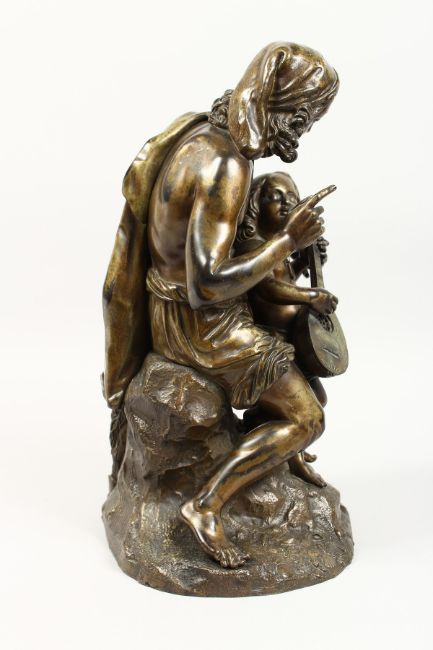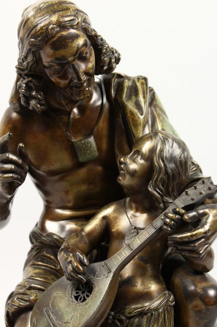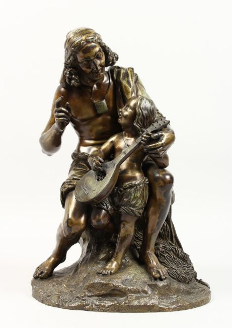 A GOOD 19TH CENTURY CAST BRONZE GROUP of a seated fisherman teaching his son to play the mandolin.
