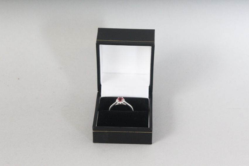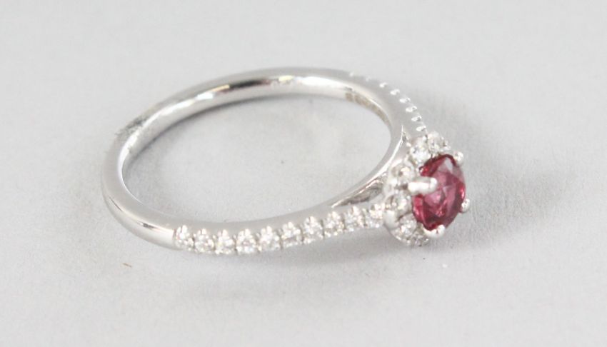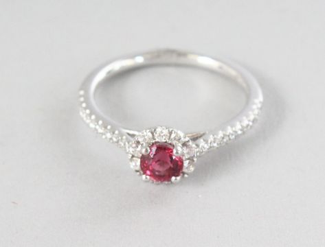 AN 18CT WHITE GOLD, ROUND SPINEL (0.50cts) AND DIAMOND (0.29cts) HALO RING.