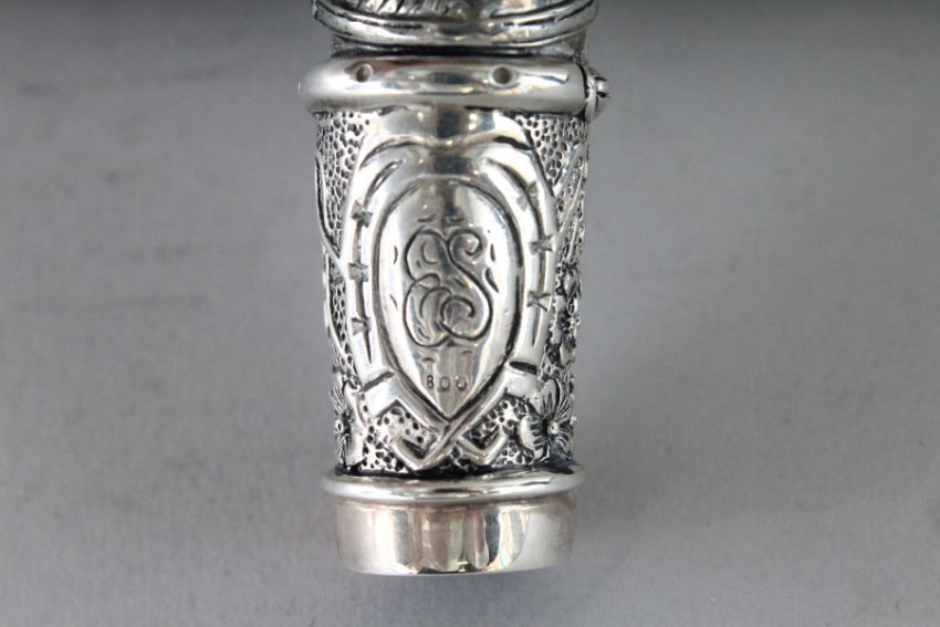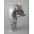 A WHITE METAL HORSES HEAD CANE HANDLE.