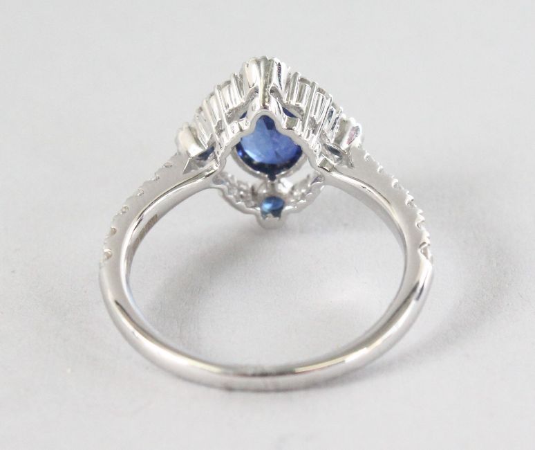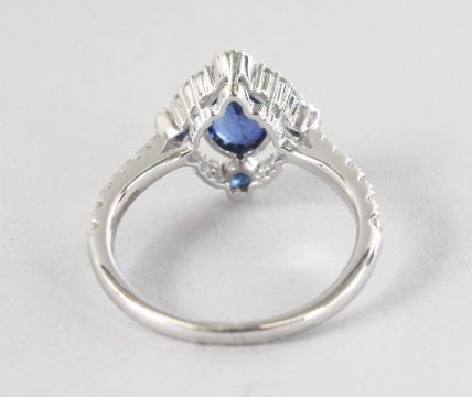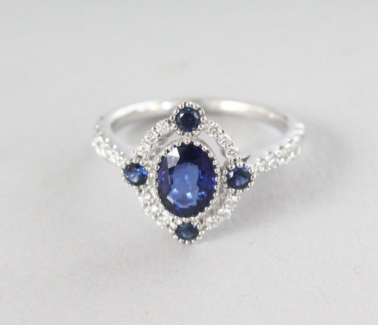 AN 18CT WHITE GOLD, SAPPHIRE (1.29cts) AND DIAMOND (0.40cts) VINTAGE STYLE RING.