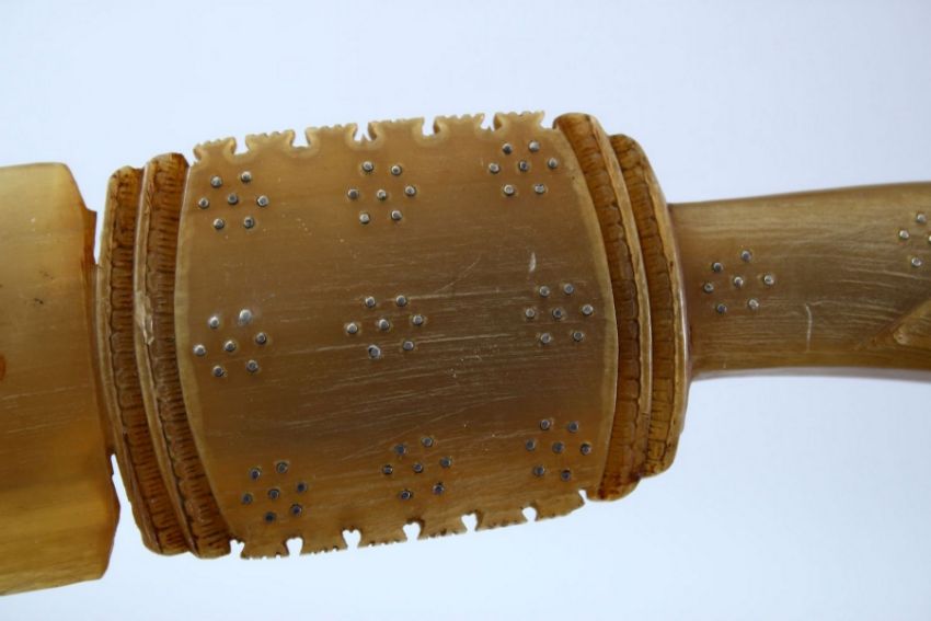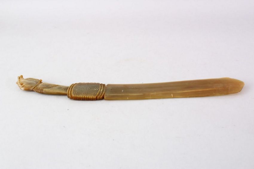 A 19TH CENTURY INDIAN CARVED RHINO HORN PAGE TURNER, crved with a fish handle and metal stud inlay, 40cm