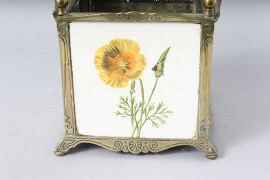 A MINTON TILE SQUARE JARDINIERE formed as four tiles with poppies, fern and butterflies, in a brass frame.