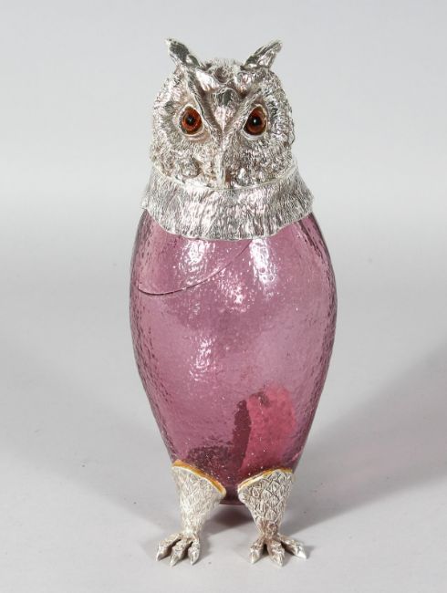 A GOOD PINK GLASS OWL CLARET JUG with plated head, collar and feet.