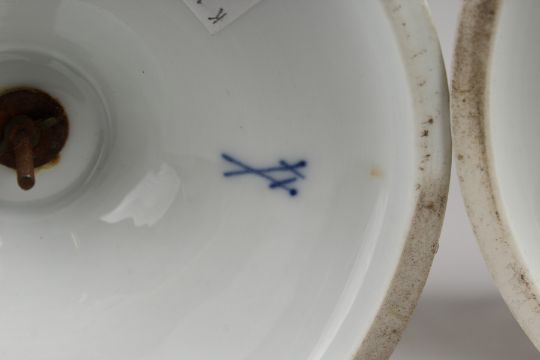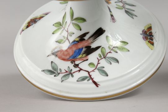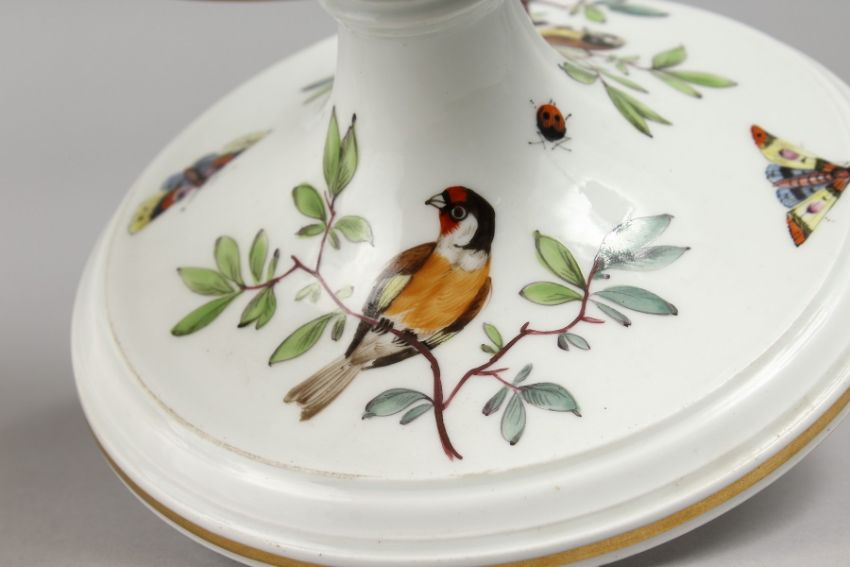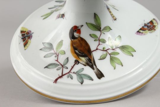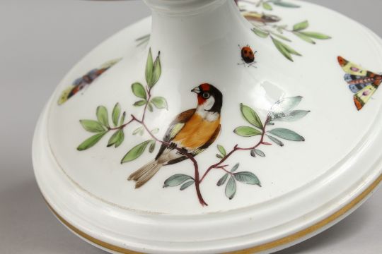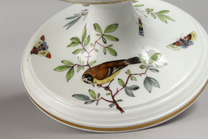 A VERY GOOD PAIR OF MEISSEN PIERCED CIRCULAR COMPORTS, 8.75ins diameter, the bases painted with birds and butterflies.