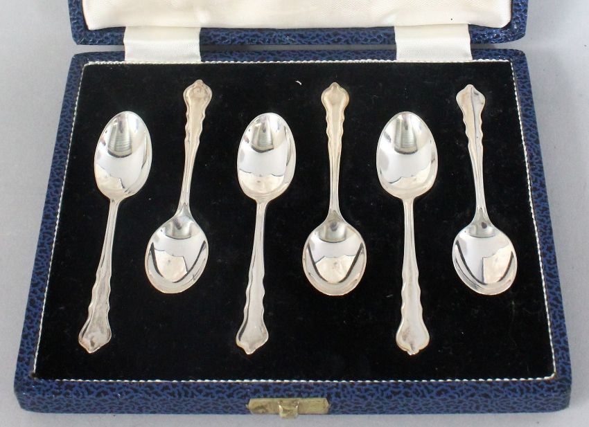 A SET OF SIX CASED MAPPIN & WEBB SILVER COFFEE SPOONS.