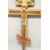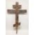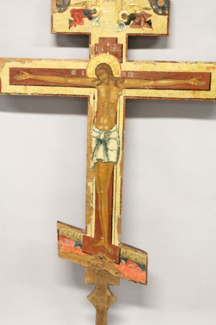 A LARGE RUSSIAN ORTHODOX PAINTED WOODEN DOUBLE SIDED THREE BAR CROSS.