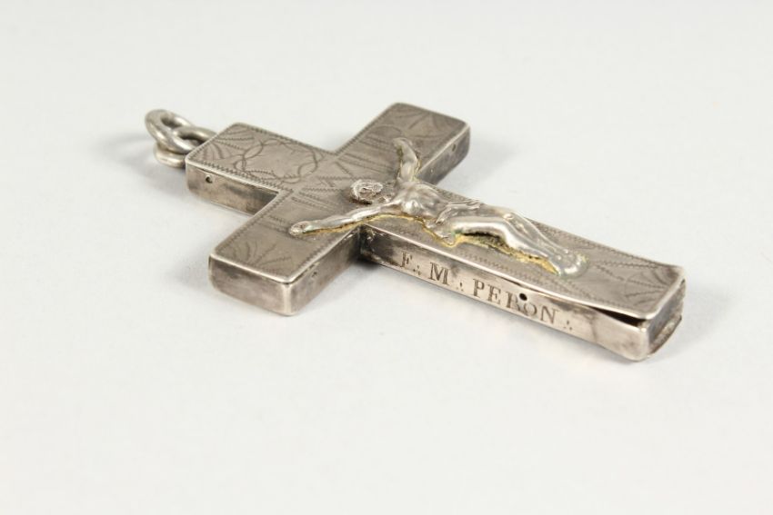 A 17TH/18TH CENTURY SILVER CRUCIFIX, mounted with the body of Christ and with engraved inscription and symbols.