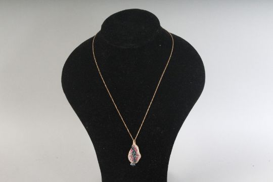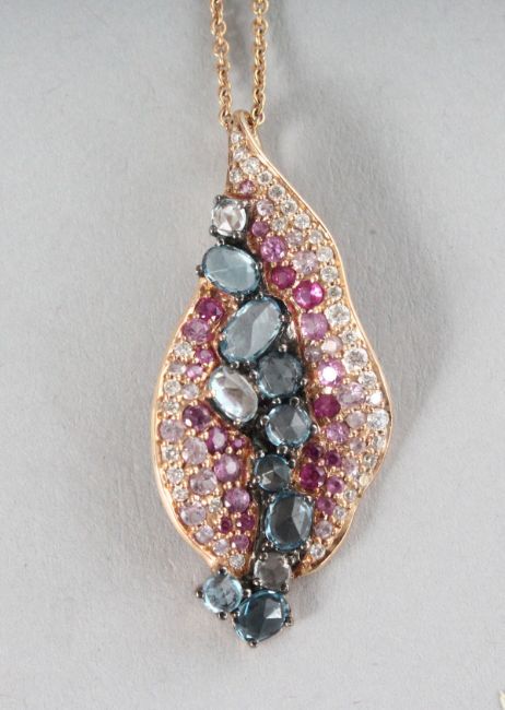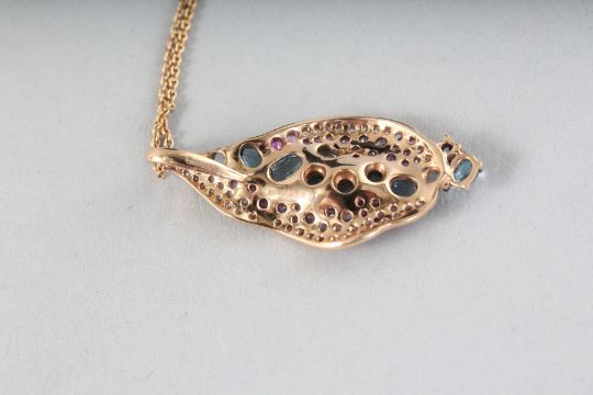 AN 18CT ROSE GOLD, AMETHYST, PERIDOT AND SWISS BLUE TOPAZ LEAF PENDANT on a chain.