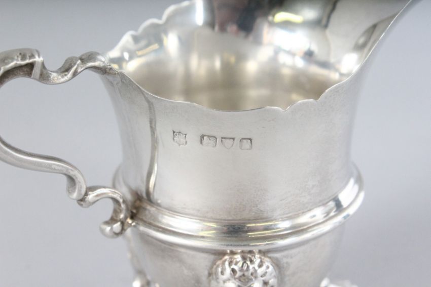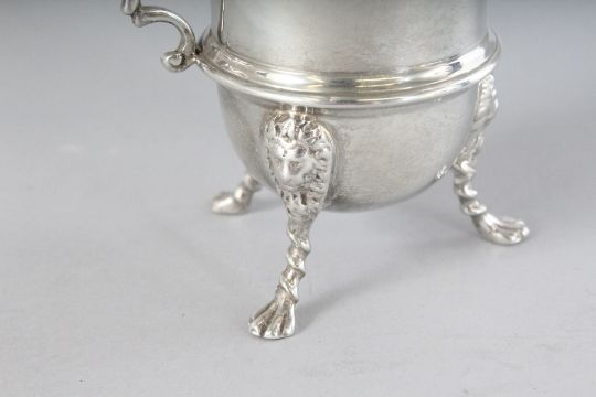 A HELMET SHAPED SILVER MILK JUG on three claw feet.
