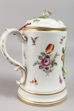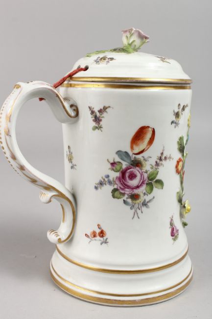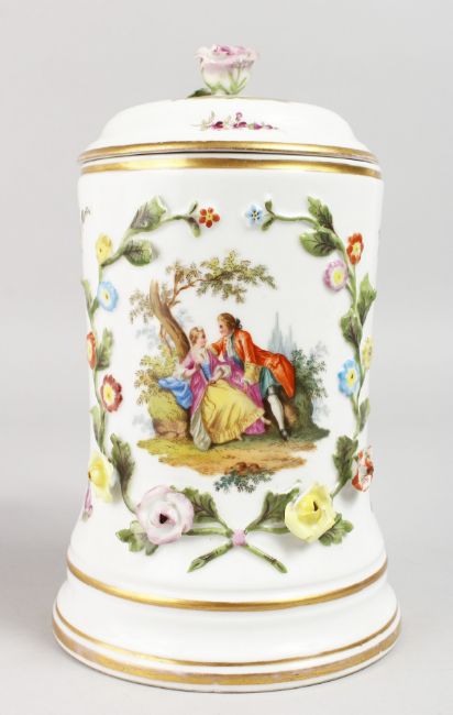 A GOOD AUGUSTUS REX DRESDEN TANKARD AND COVER, with rose knop painted and encrusted with flowers with a panel of young lovers.