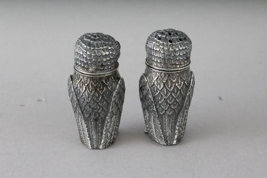 A PAIR OF CAST 800 OWL SALT AND PEPPERS.