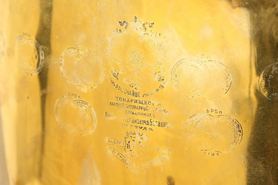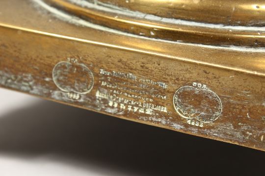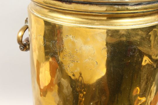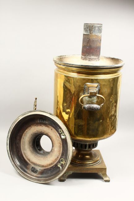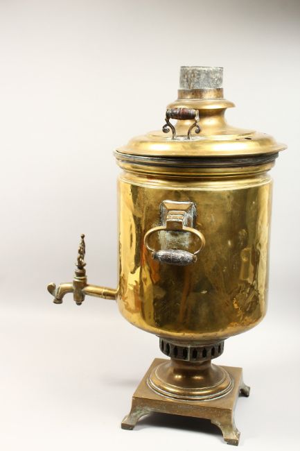 A LARGE 19TH CENTURY RUSSIAN BRASS SAMOVAR with carrying handles on square base with curving feet.