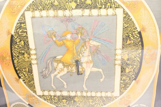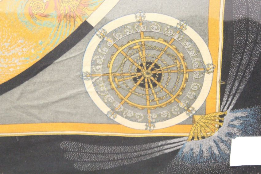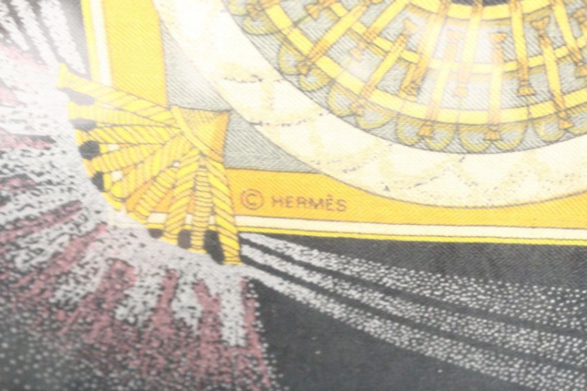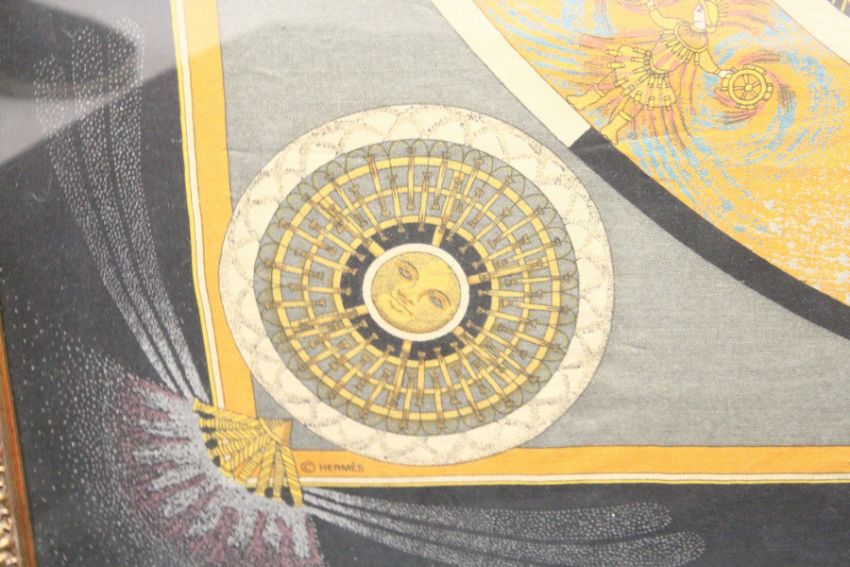 A VERY UNUSUAL LARGE HERMES SCARF, made to celebrate their 150 year anniversary, Hermes, Paris, FAUX D'ARTIFICE, 1837-1987, in a decorative gilt frame.