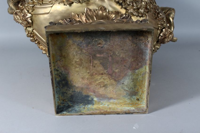 A SUPERB LARGE CLASSIC GILT BRONZE CENTREPIECE, mounted with classical figures, garlands and leopard head, on claw feet with square base.
