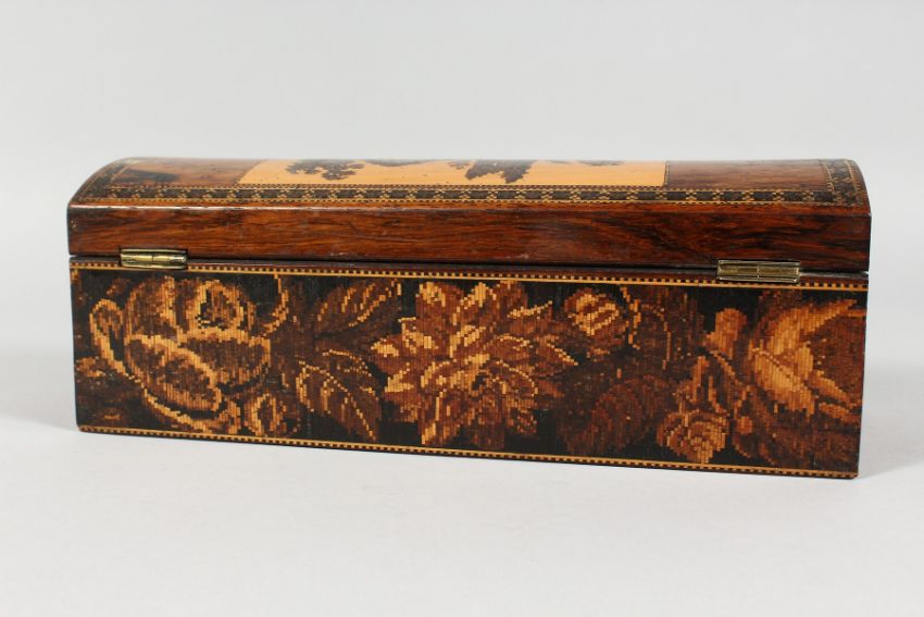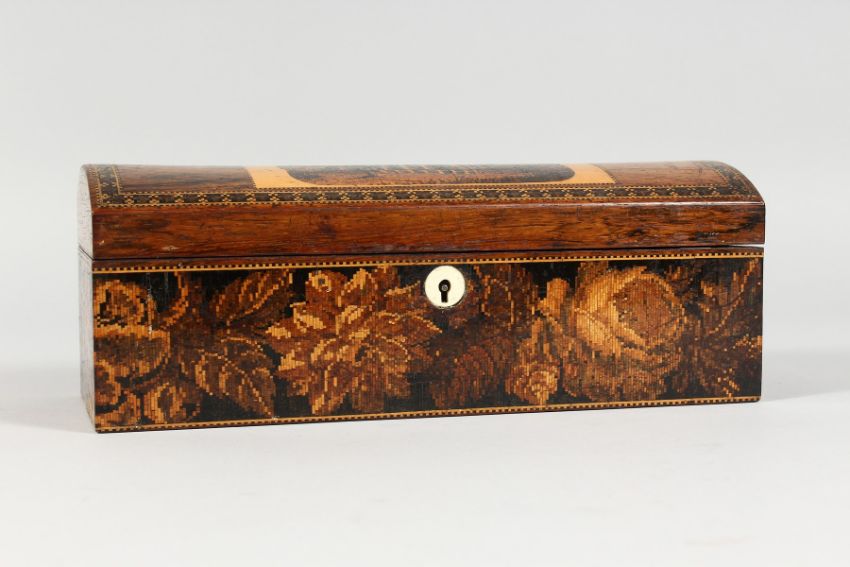 A TUNBRIDGE WARE DOMED TOP BOX, red velvet interior.