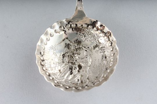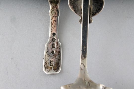 A GEORGE IV SILVER FIDDLE PATTERN CADDY SPOON, Birmingham 1826, and A DUTCH SPOON (2).