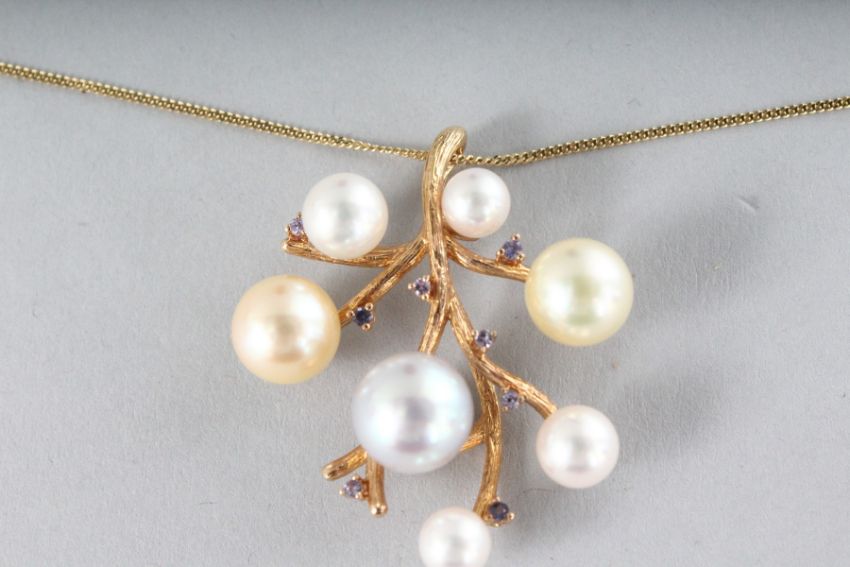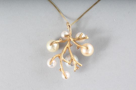 AN 18CT YELLOW GOLD, CULTURED PEARL AND PINK SAPPHIRE TREE PENDANT.