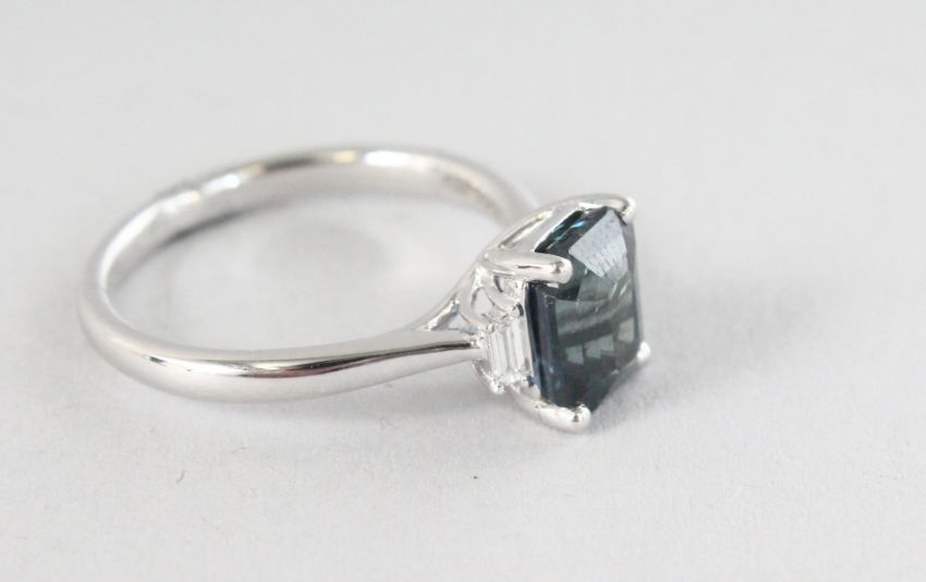 A PLATINUM RADIANT GREEN SAPPHIRE RING, 2.77cts, with baguette diamond shoulders, 0.07cts.