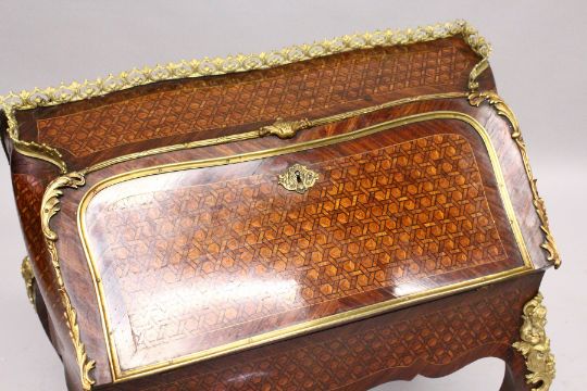 A GOOD LOUIS XVI DESIGN KINGWOOD, ROSEWOOD AND ORMOLU PARQUETRY BUREAU DE DAME, with galleried top, fall front, on cabriole legs, with rich ormolu mounts.