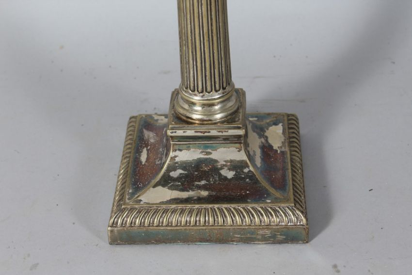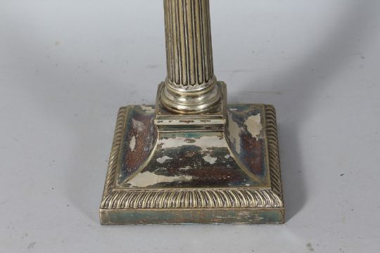 A SILVER PLATED CORINTHIAN COLUMN OIL LAMP with cut glass reservoir.