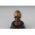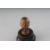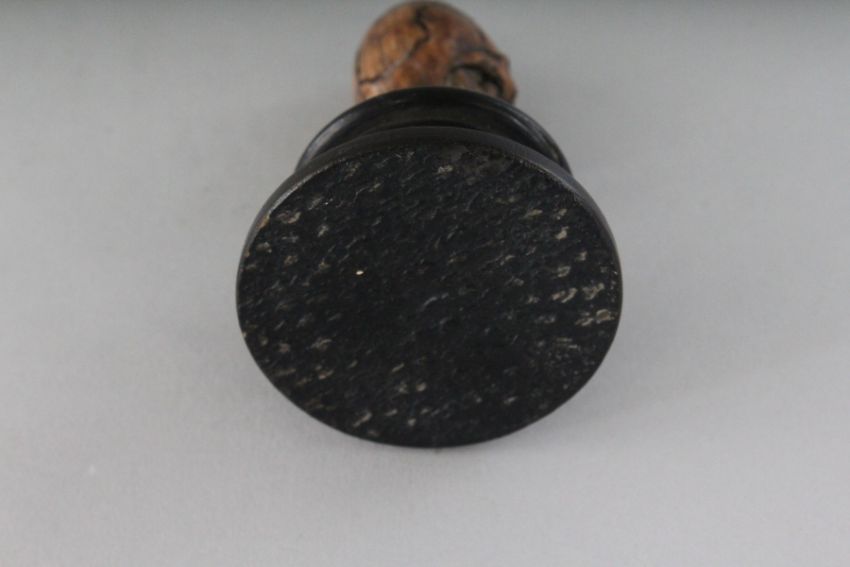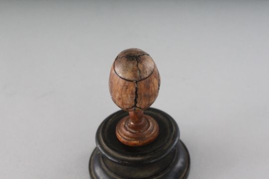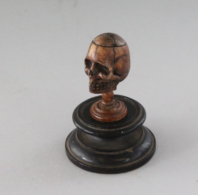 A SMALL CARVED BONE SKULL in a circular wooden box.