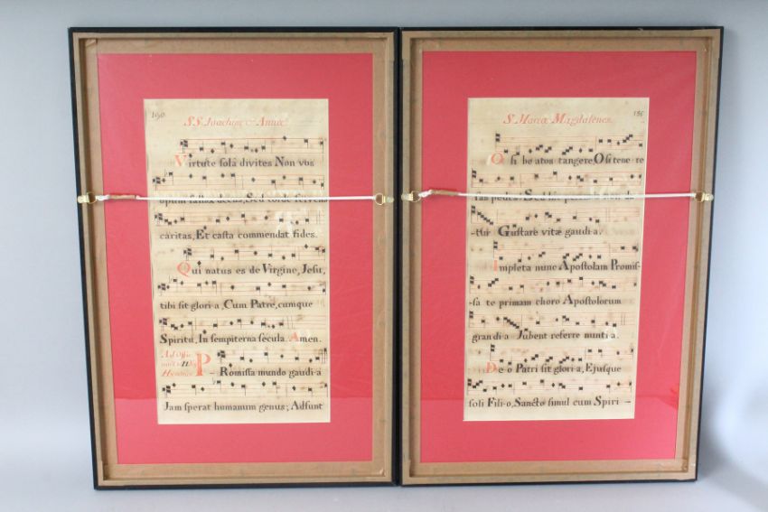TWO FRAMED AND GLAZED 17TH CENTURY HYMNAL LEAVES, double sided, No's 185-186 and 189-190.