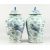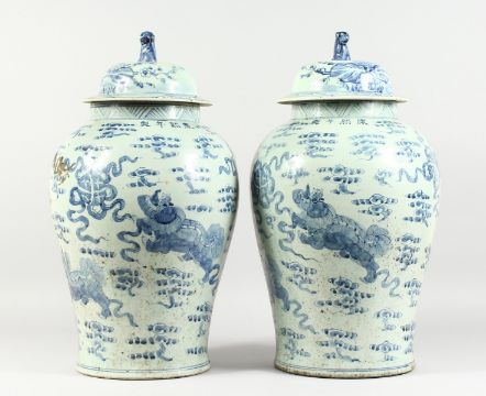 A PAIR OF 20TH CENTURY CHINESE BLUE AND WHITE BALUSTER SHAPE TEMPLE JARS AND COVERS, painted with lion dogs.