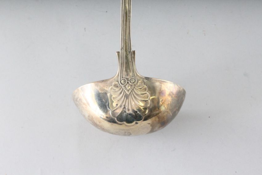 A VICTORIAN QUEENS PATTERN SILVER SOUP LADLE.