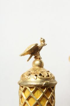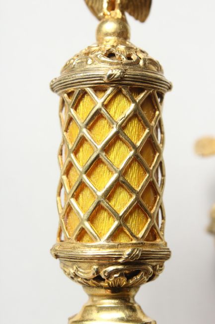 A SUPERB RUSSIAN SILVER GILT AND ENAMEL MAGNIFYING GLASS AND PAGE TURNER with eagle finial (2).