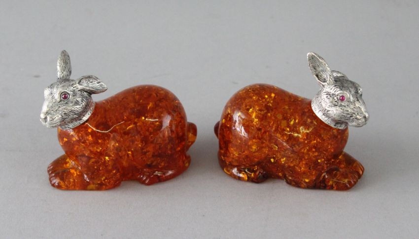 A PAIR OF AMBER RABBITS with silver heads.