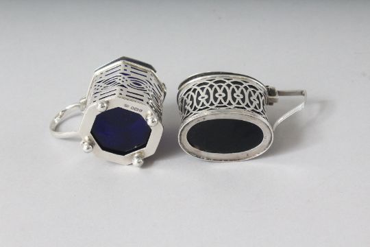 TWO PIERCED MUSTARD POTS with sapphire blue liners.