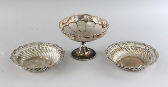 A SILVER CIRCULAR TAZZA, Birmingham 1912, and a pair of pierced circular dishes, 4.5ins diameter, Birmingham 1904 (3).