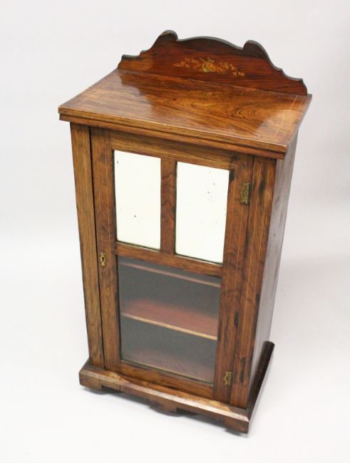 A VICTORIAN ROSEWOOD MUSIC CABINET, with a mirrored and glazed single door, on a plinth base with castors.